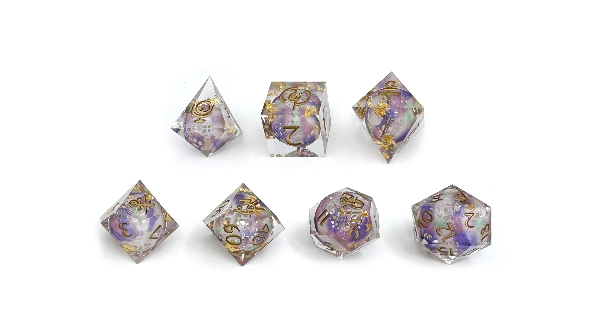 - 7 "Anomaly" Resin Dice with Plastic Orbs and Gold Flakes